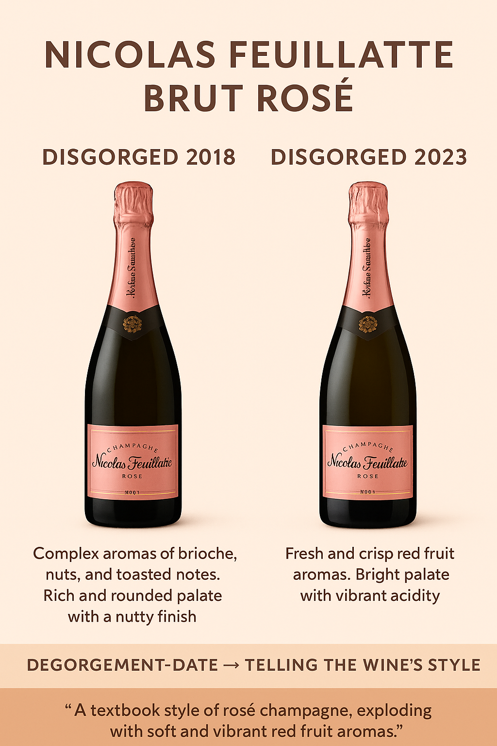 → 신선한 과일 → 말린 과일, 꿀, 토피, 브리오슈, 견과류 - 샴페인 하우스는 종종 Disgorgement Date를 표시하여 소비자가 ‘현재 스타일’을 이해할 수 있게 함.
